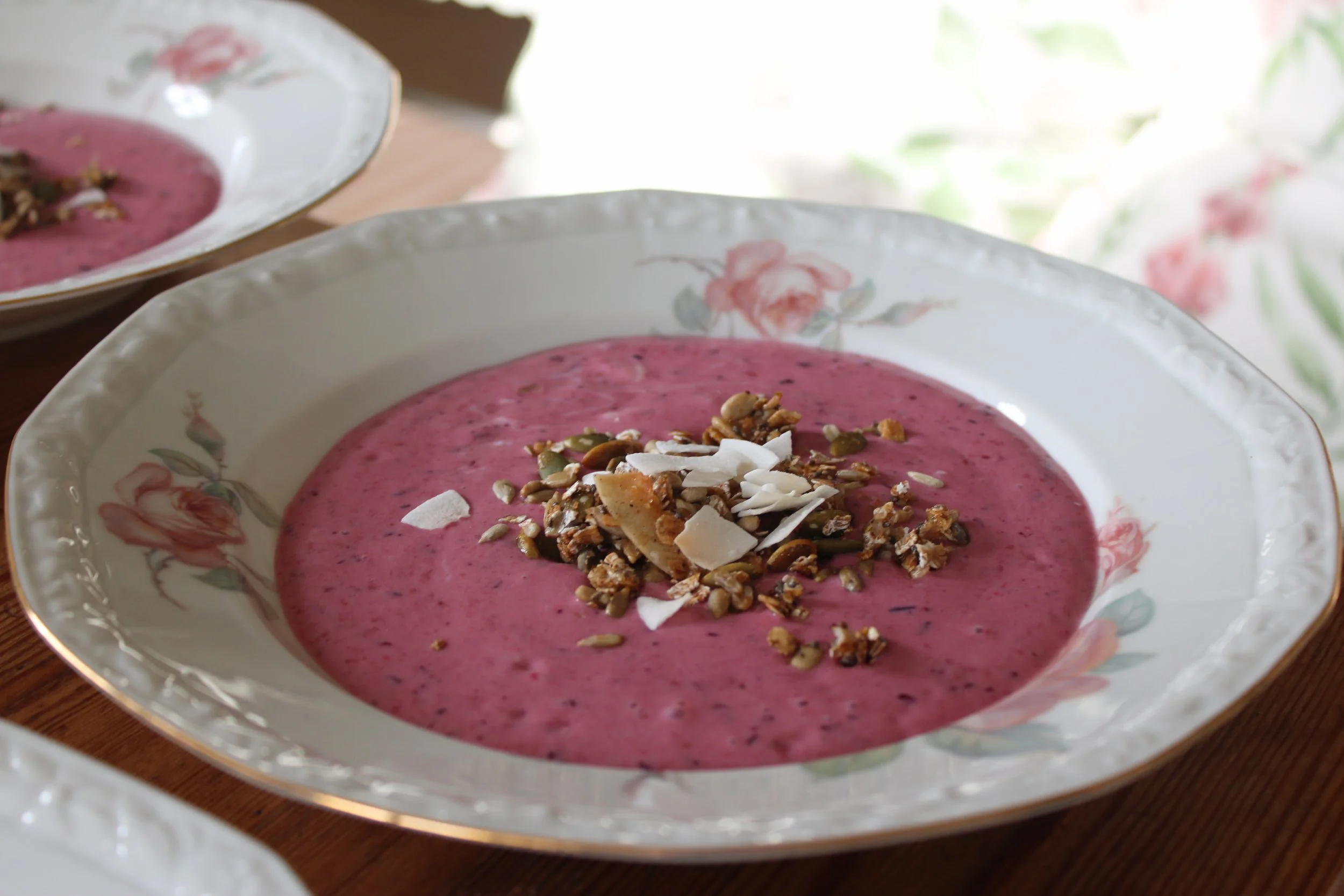 En rosa, god smoothie som går att dricka eller att ha i stället för yoghurt med crunchy.